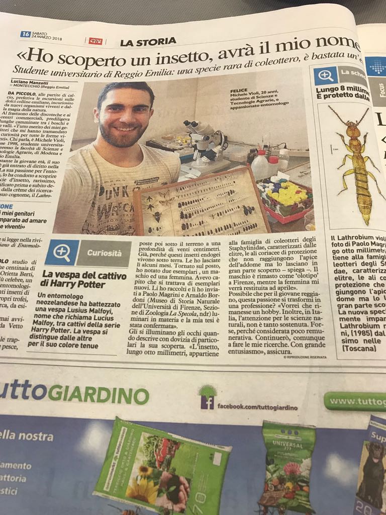Si! Secondo me si sarebbe potuto evitare, non sono il primo giovane "entomologo" che scopre o descrive una nuova specie, e di sicuro non sono "entrato nella storia" come cita l'articolo, però può essere un modo per far conoscere questi bellissimi e interessanti insetti :)