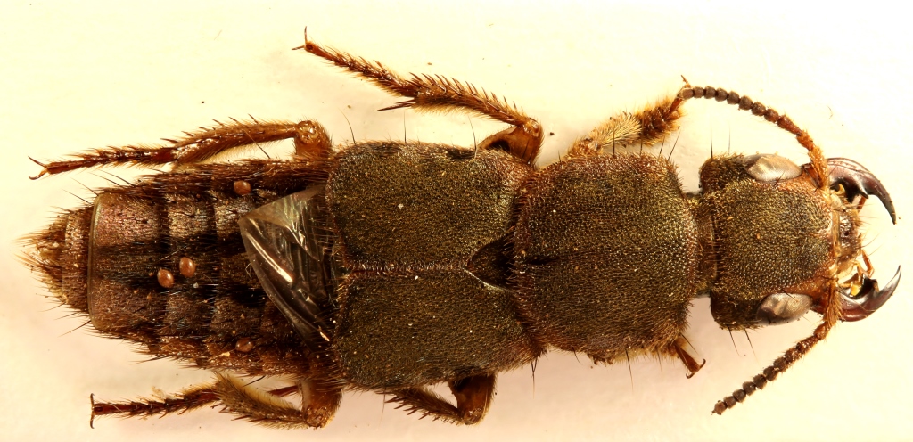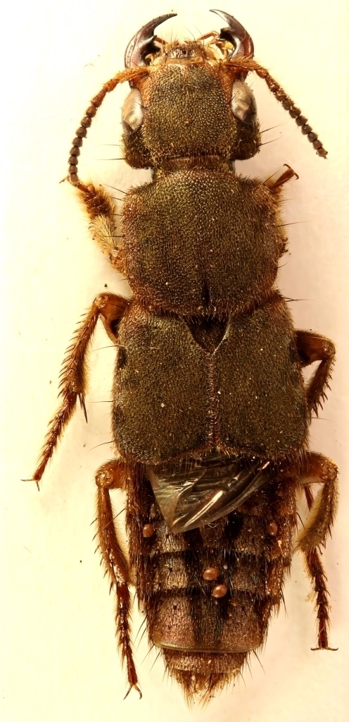 Con una coincidenza del tutto fortuita con questo stafilinide (ma, diceva Woody Allen a chi gli chiedeva se credesse di essere Dio, bisogna pure avere un modello :lol1: ), comincio a proporre anche qualche stafilinide gabonese. Finora, tra tutti i partecipanti alle due spedizioni, ne è stato presentato solamente uno. Questo è l'esemplare di maggiori dimensioni (17 mm, ma si è accorciato seccandosi), arrivato alla luce.