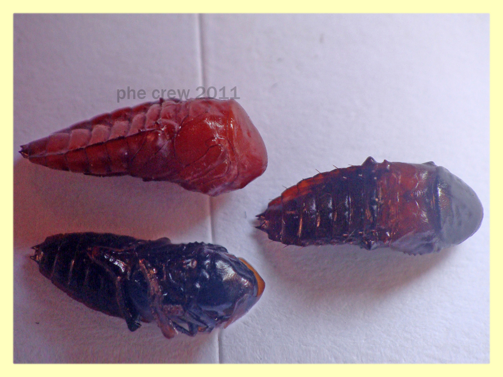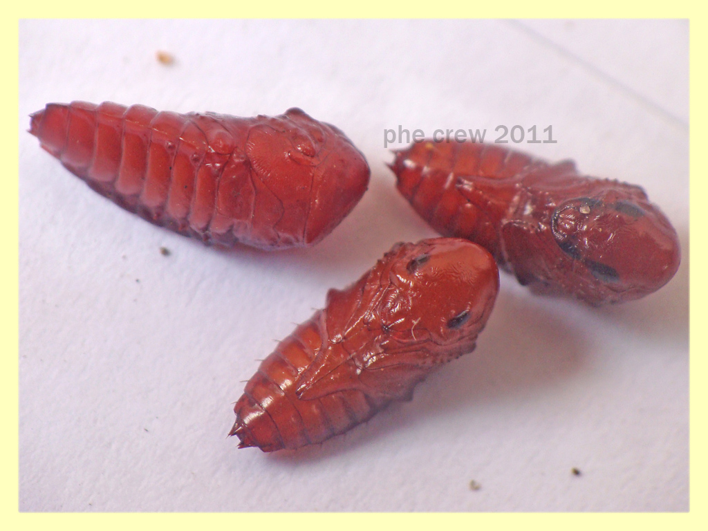 trovate 3 pupe sotto a delle tavole di legno, il primo è uscito l' 1.IV.2011, le seconde il 6.IV.2011
