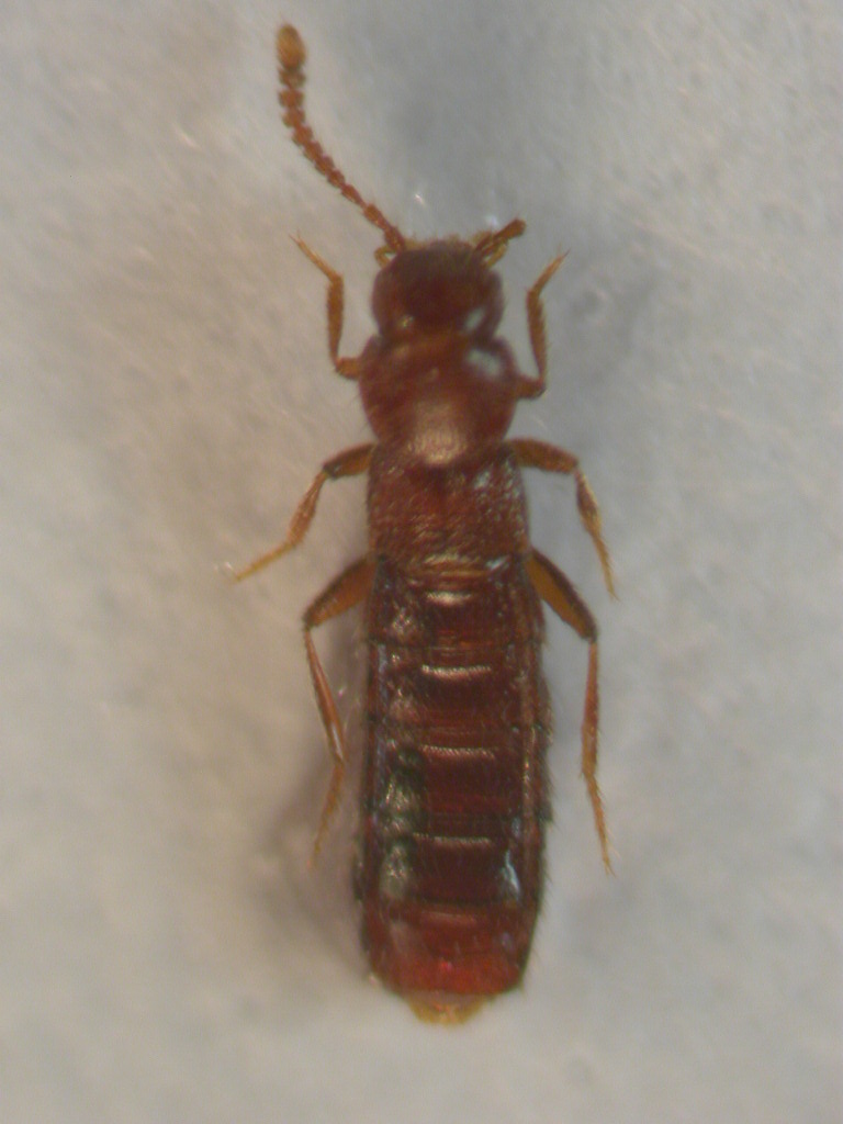 Una delle Geostiba catturate grazie al selezionatore (anche se per lo più sono facilmente individuabili a vista quando si esamina il detrito sotto la lente). L'esemplare misura circa 2 mm: ho provato anche a estrarlo, sperando possa essere utile: