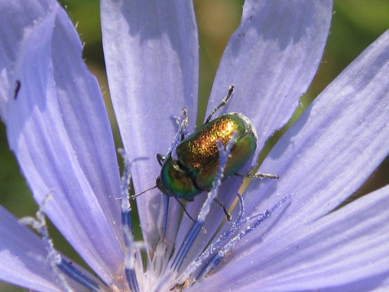 Un Chrysomelidae su fiori di Cichorium intybus.