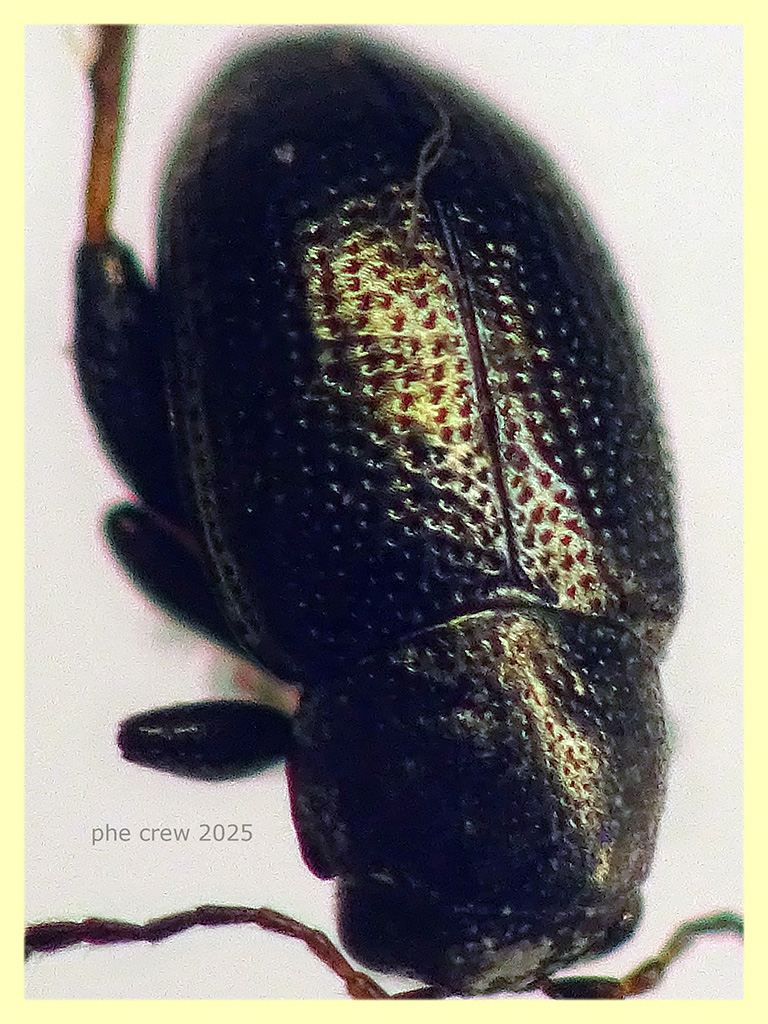 ...la microreticolazione e' presente, si vede a malapena sulle elitre nella foto 4 e i punti sulla fronte arrivano fino alle attaccature delle antenne. Sembra che il pronoto non sia bordato.