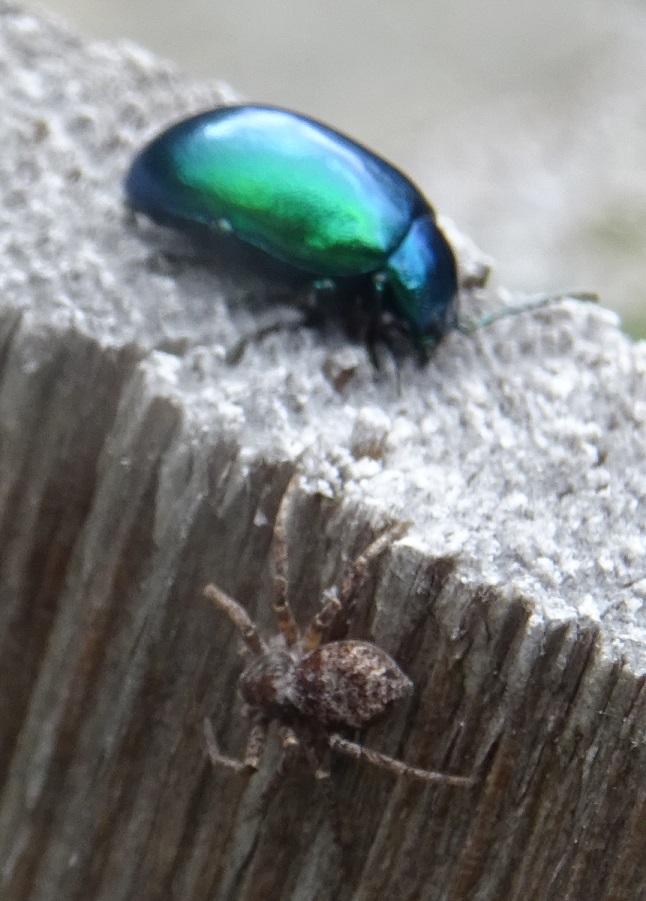Posto due esemplari contemporaneamente perchè mi sembra interessante la scena di caccia. Il ragno (di che specie?) si è avvicinato di soppiatto in verticale. La preda (Cryptocephalus? O...?) è rimasta immobile. Poi si è immobilizzato anche il ragno. Non so come sia andata a finire perchè ci siamo allontanati prima che si muovessero.