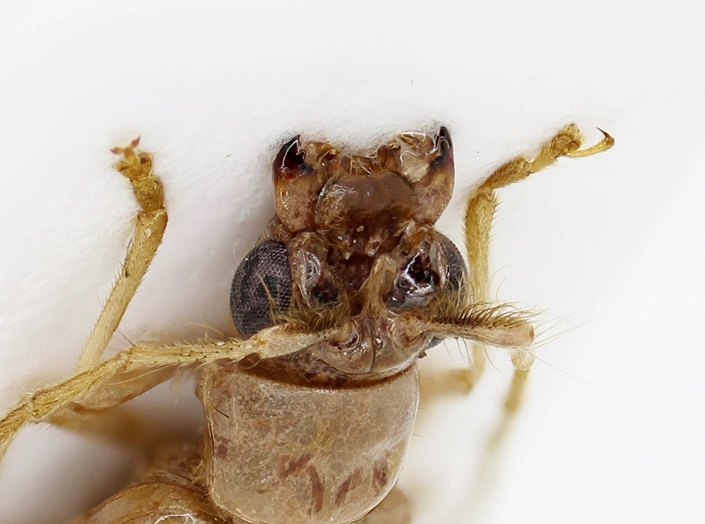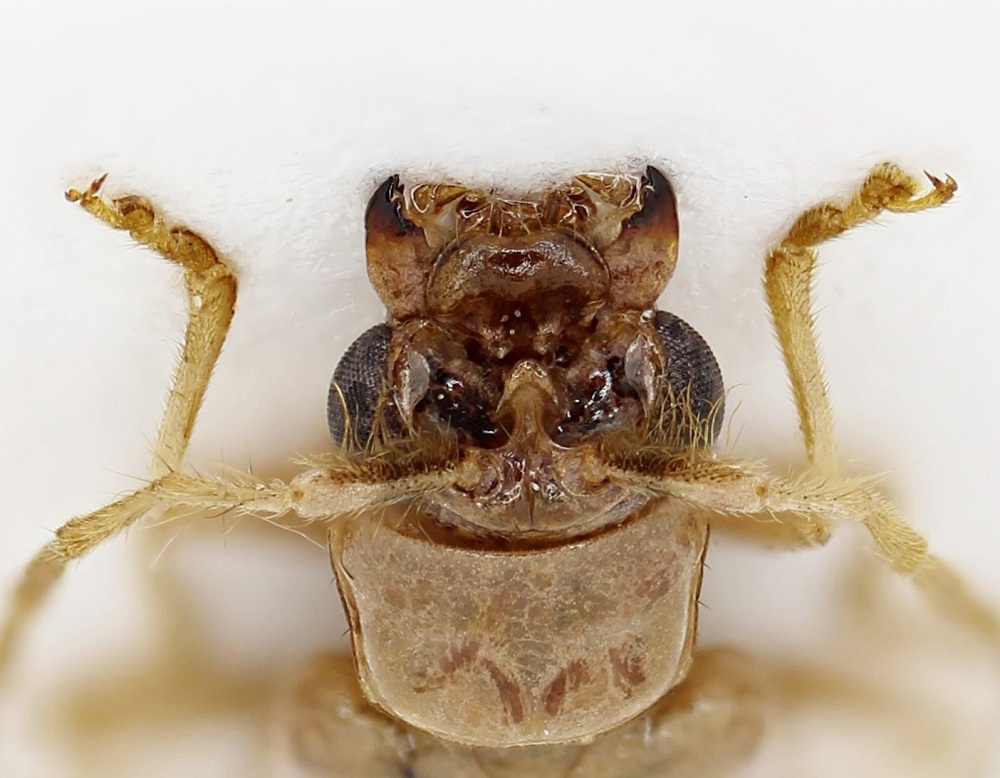 Profonda incavatura della fronte, presenza di un corno prominente, sottili lenti chitinose in vicinanza degli occhi e del labbro, ecc.