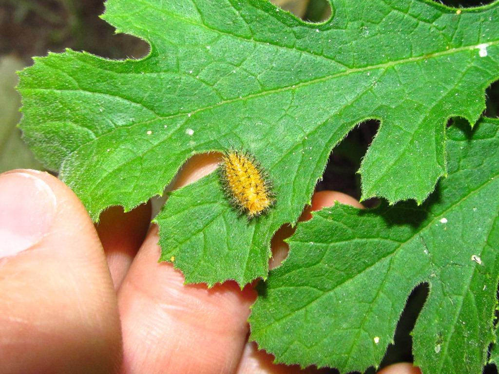 su tutte le mie cucurbitacee, melone, anguria e zucchine. si nutrono delle foglie dei fiori, ma rosicchiano anche i piccoli meloni solo superficialmente. spero che la larva sia della stessa specie :hi: