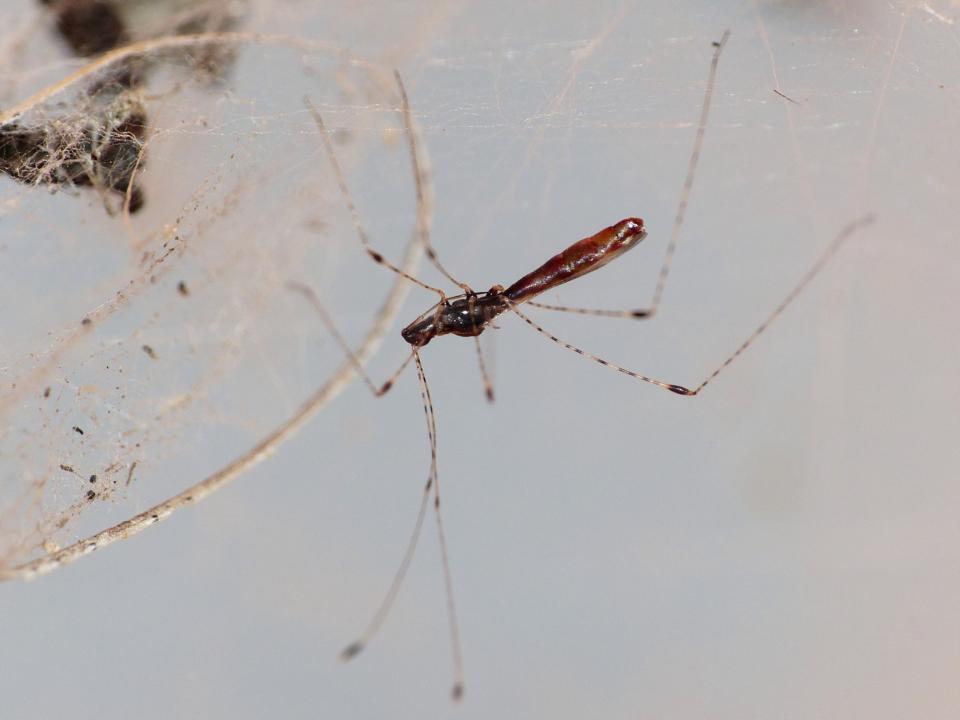 Sono piccoli (questo sarà lungo 4mm) e si mimetizzano bene con i detriti e i fili della ragnatela.