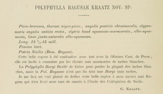 Dunque, nell'esempio della Polyphylla dedicata ad Enrico Ragusa da me riportato, malgrado l'autore (Kraatz) l'abbia, nel 1882 descritta come: indicando però chiaramente che voleva dedicarla all'amico entomologo Enrico Ragusa e malgrado faunaeur (e non solo) continui a riportarla come P. ragusae (vedi qui), il binomio corretto è: Polyphylla ragusai (Kraatz, 1882). Giusto