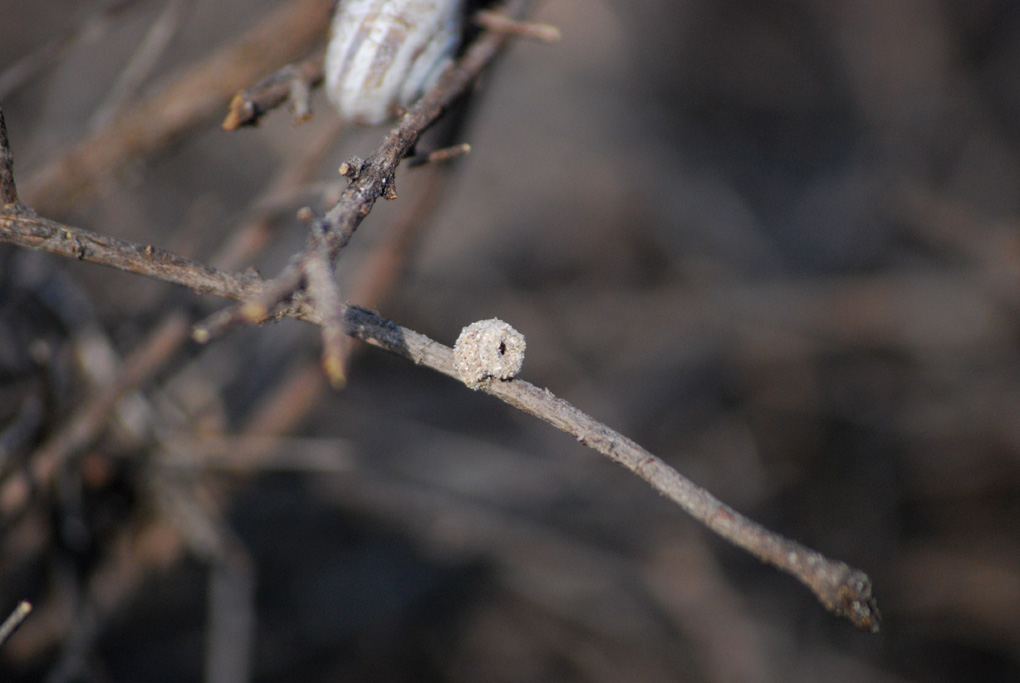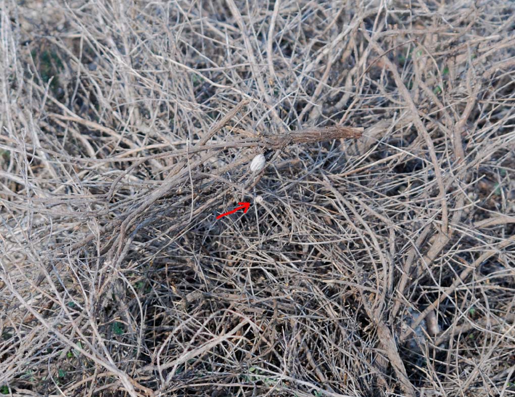 Aggiungo alcune foto dell'astuccio di Apterona helicoidella (Vallot, 1827) in natura (Parco del Molentargius - Cagliari). La nota dolente della ricerca degli astucci degli Psychidi, è la difficoltà di scorgerli in quanto estremamente mimetici: eccone un esempio (il punto dove si trova l'astuccio è segnalato con la freccia):