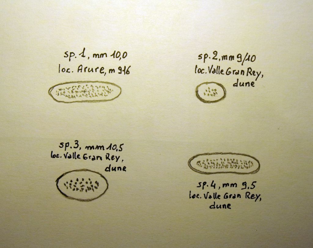 Anche questa reperita sotto le pietre retrostanti la spiaggia, assieme ad amaroides e altri: mm 10.5. La fossetta pilifera è ellittica, abbastanza grande; al fine di aiutare a valutare le varie forme di fossetta, posterò qui e nella prossima specie (la 4 del disegno) il confronto delle stesse, abbinate alle quattro tipologie osservate (quindi escluso amaroides). Dal momento che le specie con fossetta a a Gomera sono 3 sarebbe evidente che due delle tipologie (quella allungata stretta) si riferiscano alla stessa specie, anche se trovate in ambiente diversi, ad Arure (oltre 900 m) e in spiaggia. Questa corrisponde alla specie 3 del disegno. Grazie. :hi:
