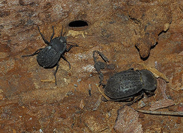 Ho fotografato questi due coleotteri, presumo maschio e femmina, sotto una corteccia di pino domestico. Di cosa si tratta?