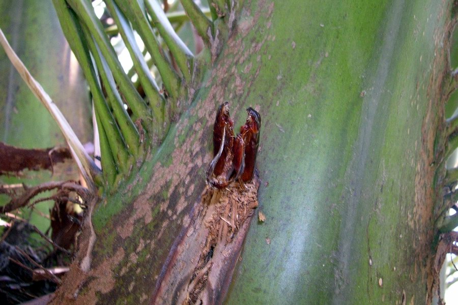 Quando le larve percorrono in lunghezza i fusti esili di queste palme e raggiungono l'apice vegetativo, distruggendolo, l'infestazione diventa letale per la pianta.