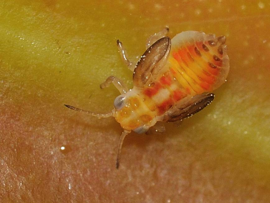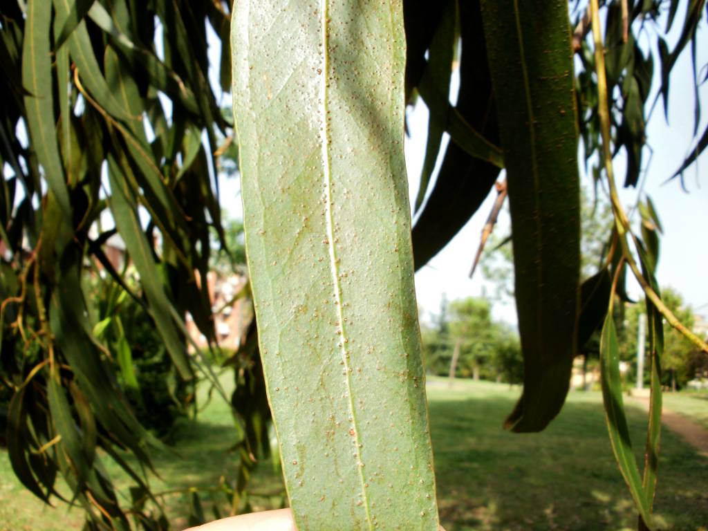 Ciao a tutti, vorrei ringraziarvi per la partecipazione e le risposte date, è sempre piacevole poter condividere informazioni su argomenti così interessanti. Ieri sono tornato sulla terrazza, per dare un'occhiata dall'alto, volevo controllare se intorno c'era qualche Eucalyptus. La mia sorpresa è stata grande quando ho visto una chioma che sporgeva sul lato opposto della terrazza. Si tratta proprio di questa pianta, non so quale specie, ma è lei. Il tronco ha diametro tra i 60-70 cm, l'altezza credo sia dai 18-20 m (la terrazza è al quinto piano, quindi circa 15 metri dal suolo). Si trova (unica!) in un piccolo parco comunale a fianco della palazzina dove vivo. Nel pomeriggio, sono andato a visionare la pianta, da terra non è molto agevole controllare le foglie in quanto i rami più bassi stanno ad un'altezza discreta, in ogni caso, allungando le braccia sono riuscito a staccare qualche foglia. Tornato a casa ho fotografato il tutto ma del Thaumastocoris nessuna traccia. Al momento credo siano presenti una gran quantità di Psyllidae (forse una fotografata è una ninfa), tutte nella parte inferiore delle foglie. Avete qualche consiglio da darmi? Potrei mettere qualche tipo di trappola sul lato della terrazza che sta di fronte alla pianta (circa 6 metri di distanza)? :hi: