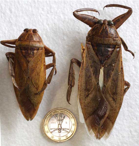 Caro Roberto, sono lieto di soddisfare la tua curiosità con due esemplari pugliesi che rappresentano gli estremi dimensionali della specie. Mi sono sembrate illuminanti le parole di Paride sulle rotte migratorie di questi agili bestioni; le luci delle navi che continuamente collegano le due sponde del basso Adriatico costituiscono una vera e propria autostrada mobile per il passaggio di specie. Ultima considerazione: soltanto quando saranno raccolte delle larve, potremo considerare che il Lethocerus si è stabilmente insediato sul territorio italiano.