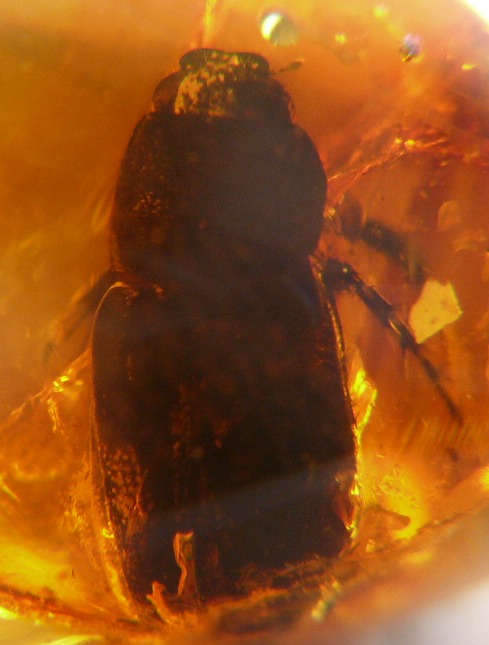 A prima vista mi ha ricordato un Hydrophilidae, tipo quelli del genere Ochthebius. Anche se sono acquatici dovrebbero spostarsi volando, quindi potrebbero essere capitati sull'albero che ha prodotto l'ambra.... ok, l'ho sparata grossa? :oops: