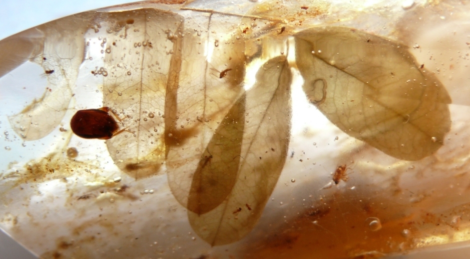 Ho in collezione questo campione di copale e al suo interno ho trovato questo coleottero fossile (0,5 cm) e un rametto di pianta credo una leguminosa anche perché di botanica ne so molto poco, ma è bello "interazione" insetto-pianta.