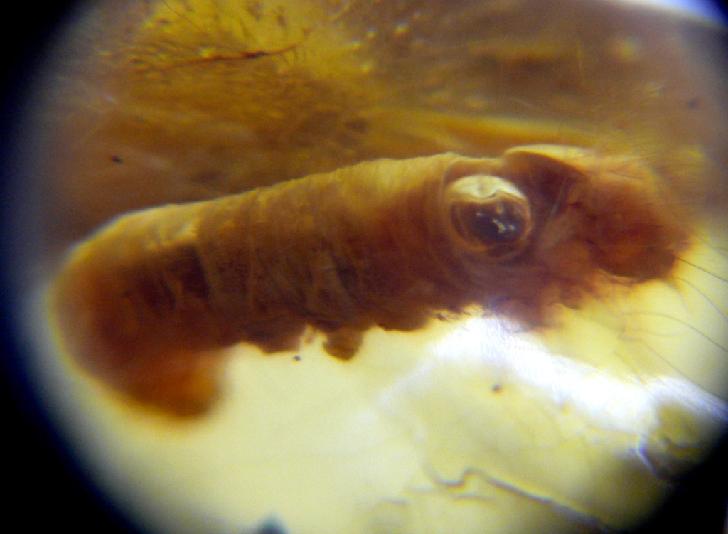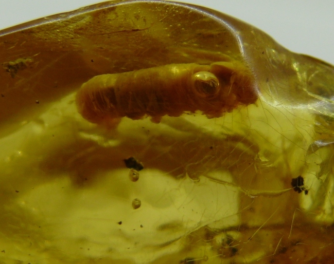 Ho in collezione questo campione di copale e al suo interno ho trovato questo bruco di lepidottero di grandi dimensioni (2,2 cm). Nella mia collezione di 500 esemplari di insetti fossili nel copale del Madagascar, questo tipo di fossile è l'unico che ho trovato, di piccoli bruchi ne ho 4-5, ma tutti di piccole dimensioni.