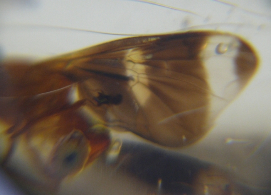 E' evidente una colorazione sulle ali dell'insetto, rimasta conservata nel copale, molto bello.