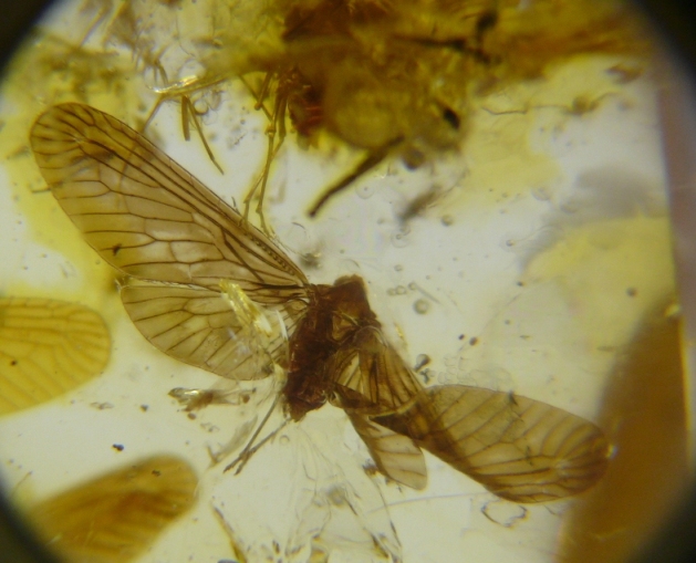 Ho in collezione questo campione di copale e al suo interno ho trovato questo bel gruppo di sette emitteri (0,5 cm misura del corpo).