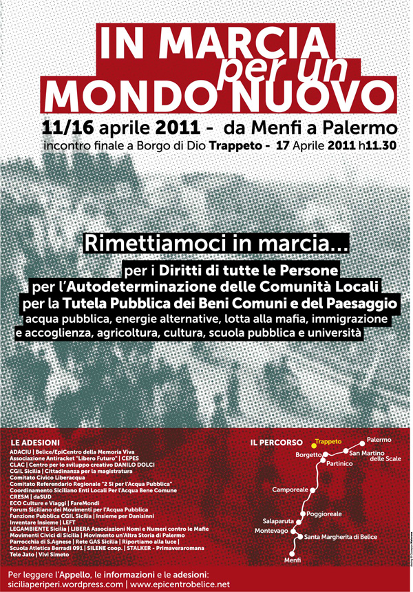 Ma il fine settimana incriminato si concludera una manifestazione per me davvero importante: la marcia per un mondo nuovo che ripercorre quella che Danilo Dolci promosse nel 1967, che con la mia cooperativa, Silene, stiamo contribuendo a organizzare nel tratto finale, da Partinico a Palermo. E' un'iniziativa in cui credo molto e che mi sto impegando in prima persona a costruire e anche se rischiamo di sembrare dei moderni don chisciotte che vogliono demolire palazzi armati di piume vogliamo almeno far sentire la nostra voce prima che le macerie ci seppelliscano....