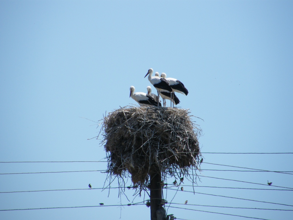 Da notare i numerosissimi passeri che approfittano nidificando nel nido delle cicogne