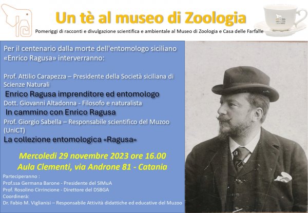Per la serie di incontri di "Un tè al Museo di Zoologia", pomeriggi di racconti e divulgazione scientifica e ambientale realizzati a cura dei Proff. Fabio M. Viglianisi e Giorgio Sabella presso il Museo di Zoologia dell'Università di Catania, si è tenuta mercoledì scorso una conferenza dedicata al decano degli entomologi siciliani, Enrico Ragusa (1849-1924), in occasione del centenario dalla morte. All'evento hanno partecipato:
