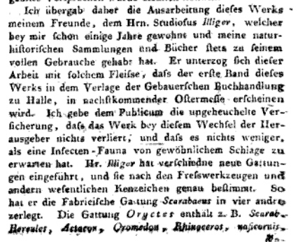 Comunico al pubblico senza indugio, e assicuro che il cambio di autore non sarà motivo ne di diminuzione di qualità, ne di credibilità. Il lettore non si dovrà attendere meno che un lavoro sulla Fauna degli insetti di abituale standard. Il sig. Illiger ha introdotto diverse nuove specie, e le ha classificate e identificate secondo l’apparato masticatorio e altre importanti caratteristiche . Cosi ha diviso in quattro il genere Fabriciano Scarabeus. Il genere Oryctes p.e. contiene Scarab-, Hercules, Acta?on, Oromedon, Rhinoceros, nasicornis, Mu?odoa, J?vencus, piceus etc. Scarabaeus mantiene le specie stercorarius, vernalis, Aeneas Panz., Typhoeus mobilicornis e tanti altri. Ad Aphodius sarà retribuito l’enorme esercito di piccoli Scarabei scutellati* da Fossor, rufipes, fimetarius fino ad asper. porcatus e simili a scendere: e a Copris saranno attribuite tutte le specie non scutellate* e dalle rimanenti ancora Aygulus, Clinias e simili. Spesso delle specie sono state spostate dai loro generi di provenienza in altri generi, e diversi generi sono stati uniti tra loro. Per la criticità delle sinonimie si è stati molto attenti, e specie coinvolte sono state esattamente descritte e loro attribuite le differentiae specificae. Alcune parti anatomiche dell’apparato masticatorio e bocca, fino ad oggi soltanto parzialmente o per nulla descritte, sono state determinate e descritte con migliore differenziazione, introducendo nuovi termini per arricchire la terminologia e definire con maggiore chiarezza queste parti. Questo dovrebbe bastare per accrescere l’interesse in questo lavoro al pubblico entomologico, che di certo non rimarrà deluso.