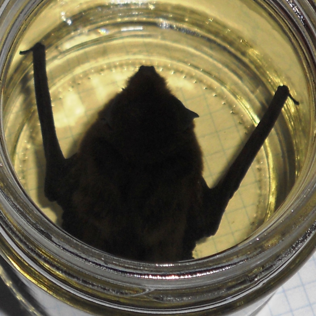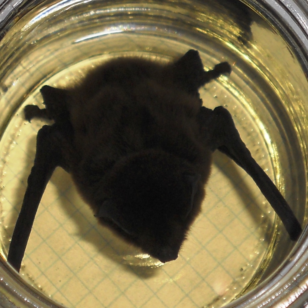 Il pipistrello mi sembra un Miniottero, però i caratteri non sono facilmente visualizzabili a causa delle foto fatte in alcool.