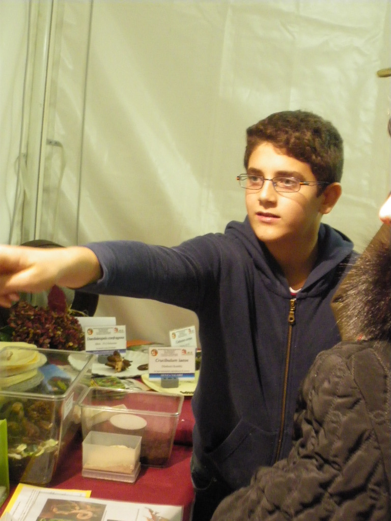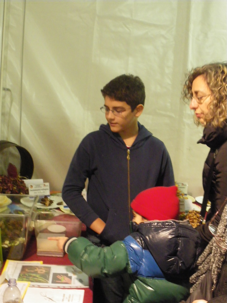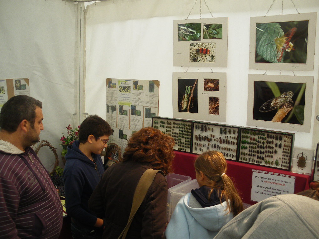 Dunque, ci siamo alzati alle 7.00 e alle 7.30 eravamo già alla mostra a scaricare le teche che la sera prima avevamo caricato sulla macchina.... allestiamo il banco con l'aiuto di mia madre e di Piero Arduini, autore delle meravigliose foto che si vedono appese alla parete dietro gli insetti. Ah, dimenticavo, a spiegare e ad aiutarmi con il pubblico c'è anche il mio caro amico Alessandro Boni, mio amico fin dall'asilo :lov2: Come spazio avevamo i due banchi (lunghi 3-4 metri) in fondo allo stand e un piccolo spazio per le teche grosse, il tutto tra la bellissimia mostra del Frutto Antico (con centinaia di avrietà di castagne, pere, mele, limoni, olive e tanto altro e annessi prodotti) e la Mostra del Fungo Reggiano (con decine di funghi veri raccolti i giorni prima nel nostro appennino con annessi cartellini identificativi), insomma una bella mostra con il tema della natura!