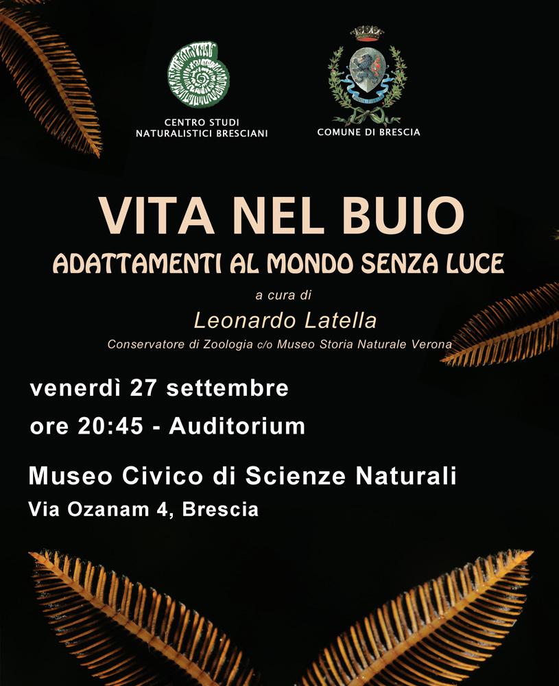 Nell'ambito delle serate che il Centro Studi Naturalistici Bresciani organizza il venerdì di ogni fine del mese il sesto incontro è dedicato alla scoperta degli adattamenti degli animali alla vita nel buio, dagli organismi che si spostano nell'oscurità della notte a quelli che vivono nelle buie profondità marine o passano la loro vita nel profondo delle grotte.