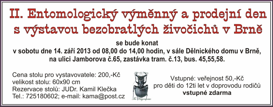 Grazie Ilja. Far pagare una piccola somma (50 czk sono meno di 2 €) come biglietto d'ingresso ai visitatori adulti, potrebbe essere una soluzione valida anche per Entomodena, visto che alcuni nel Forum si sono lamentati per la presenza di visitatori "poco selezionati". Scelta infelice quella della data, visto che coincide con l'analoga mostra di Parigi. |