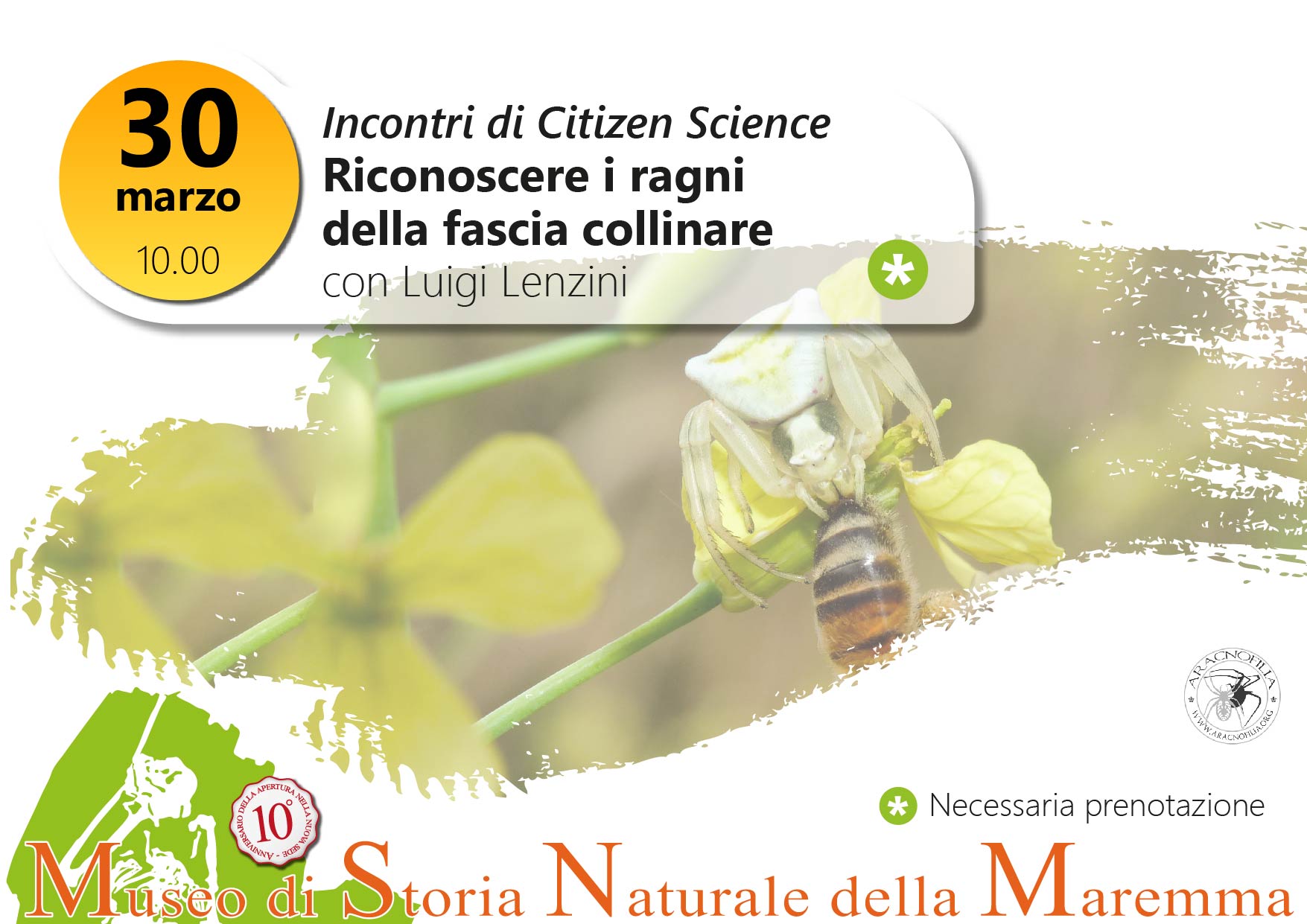 Cari amici, il prossimo 30 marzo ci sarà un incontro a carattere divulgativo presso il Museo di Storia Naturale di Grosseto, organizzato da Andrea Sforzi, in cui farò una chiacchierata generale sui ragni, e illustrerò le caratteristiche di alcune specie significative. Nel pomeriggio faremo una breve escursione in campagna (in stile Bioblitz) per incontrare e riconoscere i ragni in natura.