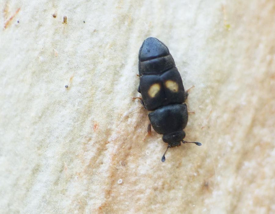 Le macchie rimandano a Carpophilus tersus Wollaston, 1865, che differisce da C. bipustulatus (Heer, 1841) per le macchie posteriormente molto oblique verso la sutura. Dato da P. Audisio di tutta Italia ma non abbondante e l'eucalipto è tra le piante date come luogo di svernamento. :hi: