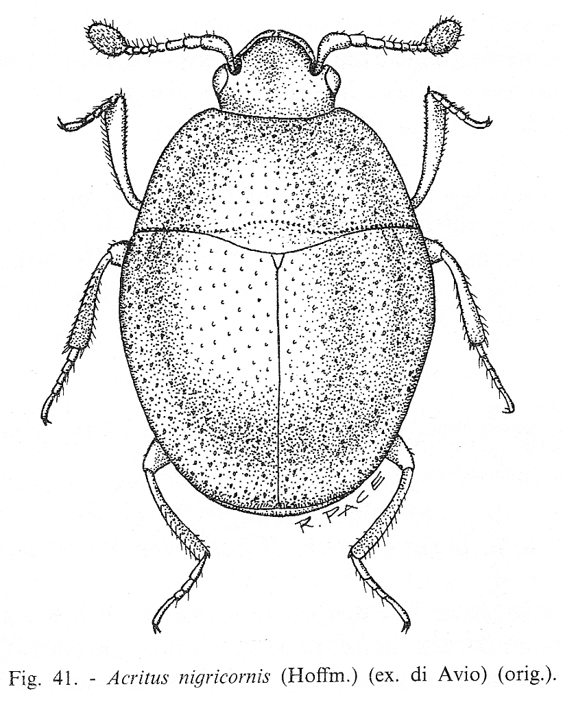 A mio avviso potrebbe trattarsi sempre di Acritus (Acritus) minutus (Herbst, 1791) anche se ha delle dimensioni leggermente minori rispetto a questo, in particolare è leggermente più corto e, soprattutto, evidentemente più stretto (potrebbe trattarsi di un maschietto e l'altro di una femminuccia :roll: ). Pure i punti sul disco del protorace sono più radi.....