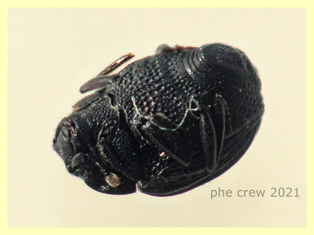 ... questo Histeridae dovrebbe essere un Onthophilus sp. trovato nel terreno. Lungo 2 mm. Purtroppo è morto chiuso ermeticamente senza riuscire a fare foto migliori. Guardando sul forum noto che il pronoto è leggermente diverso e la clava antennale è bianca. Si può andare oltre ? |