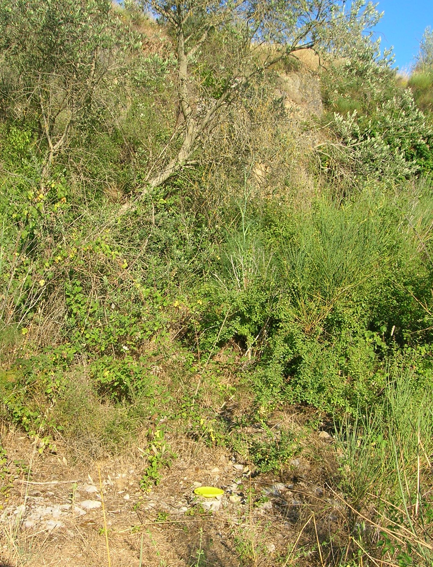 Vedendo un po' più da vicino dove colloco i piattini, parto con il luogo che mi ha fornito la maggior quantità di esemplari sia in termini numerici che di diversità specifica. Il muretto è perpendicolare alla strada bianca, dista una quarantina di metri dal bosco ed è sormontato per quasi tutta la sua lunghezza da una siepe di "macchia" che separa due uliveti. Il piattino ha funzionato particolarmente bene da fine aprile a tutto maggio, cioè quando la vegetazione non era così vigorosa e il muretto a secco aveva un maggior risalto. Ultimamente ho dovuto anche togliere l'erba da terra per mettere in ulteriore risalto il piattino, altrimenti veniva "soffocato" dalle piante erbacee che lo circondavano diminuendo notevolmente la capacità attrattiva  . Il secondo luogo è un ambiente ecotonale creatosi tra l'uliveto e il bosco. Mi hanno attratto le pareti nude di calcare esposte al sole per buona parte della giornata. La seconda immagine è un dettaglio che mostra la posizione di un piattino; è riconoscibile l'olivo che nella prima foto è in altro a destra. Concludo con l'ultima immagine (....per ora  ) per mostrarvi un terzo luogo, simile al secondo, del quale sfrutto la "discarica abusiva" di materiali inerti  contenete anche tronchi, a mio avviso buon posto di transito per i Crisidi. Ultime considerazioni. Purtroppo avendo poco tempo per dedicare alle ricerche, spesso vado a posizionare i piattini nel tardo pomeriggio (verso le 18.00) e li controllo dopo 24 ore. Ho notato due inconvenienti: il primo è che talvolta i piattini sono completamente divelti dai numerosi animali presenti in zona (una vola, dentro il piattino, ho trovato addirittura una "fatta" piena di noccioli di ciliege  ). Il secondo inconveniente, che forse mi fa ancora di più arrabbiare, è l'essermi accorto che delle GRAZIOSE LUCERTOLE si erano abituate a delle prede "facili" rimanendomi come unico risultato all’interno del piatto dell'acqua sporca  . Altra osservazione, lasciare i piattini per più giorni, controllando e rinnovando il liquido, mi ha offerto dei risultati inversamente proporzionali al tempo di trappolamento.