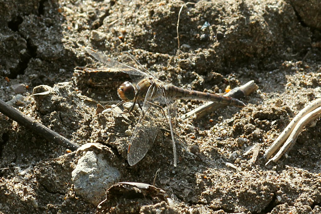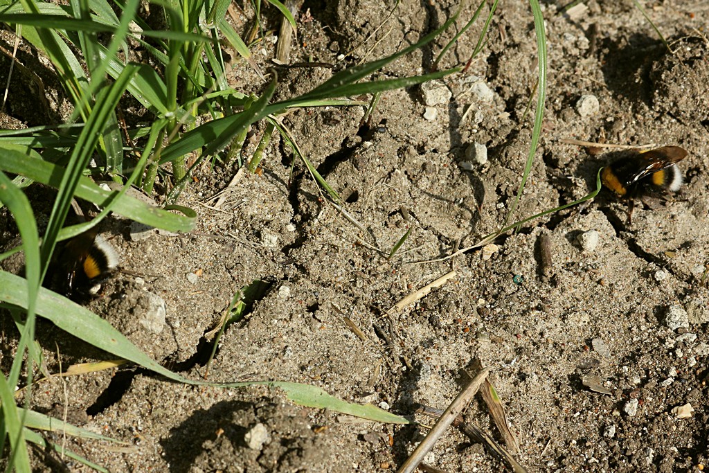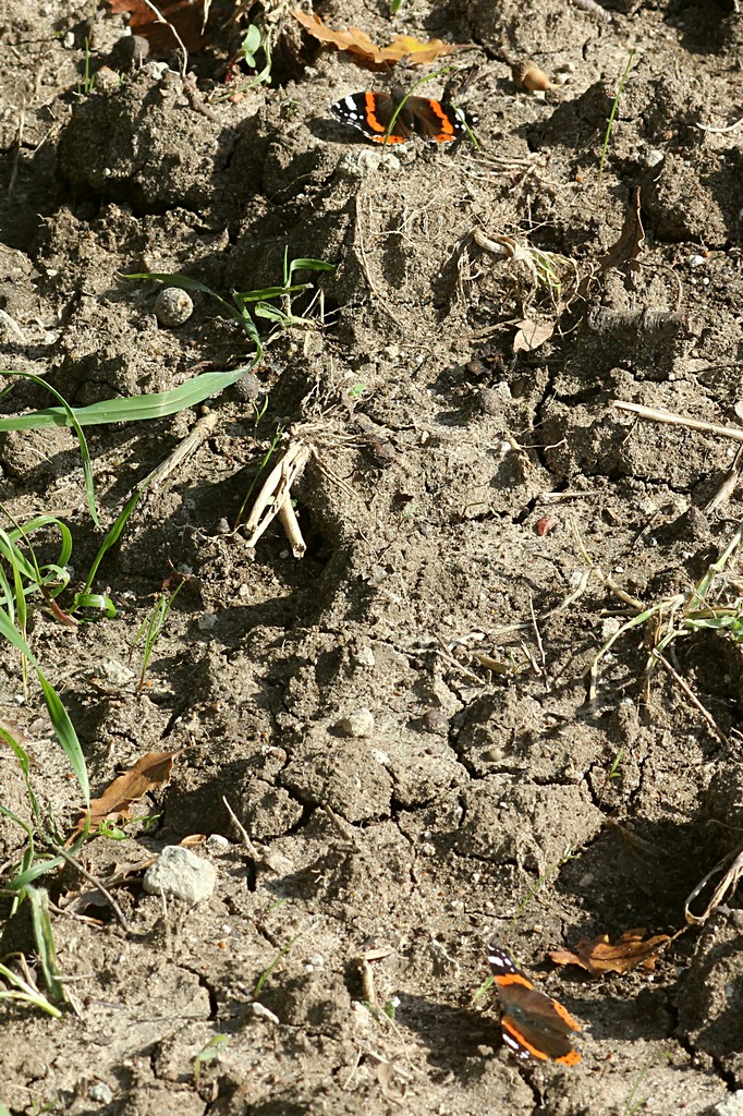 Ieri, come ho scritto, sono tornato sul posto per vedere se riuscivo a prendere qualcosa di quanto chiesto da alcuni amici del Forum. Il posto si presentava abbastanza simile a 8 giorni prima. La differenza principale era che il grano stava cominciando a spuntare con piantine alte pochi cm, come si vede in questa foto di ieri. Molto diversa, invece, la situazione entomologica. Alcune delle specie della settimana prima c'erano ancora, ma in numero molto più basso. Qualche Cicindela campestris, qualche Chrysolina interstincta, pochi Brachycerus, solo un paio di Tentyria italica, un solo Scaurus striatus, nessuno dei Curculionidae della volta precedente, eccetto le Sitona (almeno 2, forse 3 specie), più numerose dell'altra volta, e poco altro. Inoltre quasi tutto era tra la vegetazione erbacea sul bordo, e non sul terreno scoperto del campo. La temperatura era simile, forse anche più alta della settimana scorsa, l'orario lo stesso (11-13), ma il terreno era asciutto in superficie (umido già a meno di 1 cm di profondità), mentre la volta scorsa era umido anche in superficie (aveva piovuto il giorno prima), l'aria più asciutta, e soprattutto c'era molto vento, che l'altra volta mancava. Probabilmente queste differenze sono bastate a far cambiare la fauna entomologica (o almeno a farla distribuire diversamente nell'area). Al contrario della volta scorsa, ho notato alcune specie di non Coleotteri presenti in gran numero. Per cominciare, una specie di libellula, che invece di posarsi in appostamento sugli steli, si posava a terra nel campo, forse proprio per risentire meno del vento. Ecco maschio e femmina: Molto frequenti anche questi bombi, tutti a terra, per la maggior parte lungo il bordo del campo, vicino alla striscia di piante erbacee che lo delimita. Apparentemente intenti a scaldarsi al sole. La terza specie presente in gran numero era questa farfalla, Vanessa atalanta, se non sbaglio, più attiva dei bombi, ma sempre tendente a restare piuttosto ferma, a terra a scaldarsi al sole.