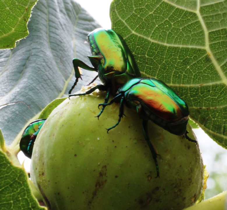 Veniamo ad agosto: sono rientrato solo pochi gg fa, ma mi sono trovato davanti il solito spettacolo tardo estivo con molte Protaetia (Cetonischema) speciosissima (Scopoli, 1786) attratte nello specifico dai fichi un po' avanti nella maturazione! Sul mio piccolo albero di fico ne ho contati anche 10 ess allo stesso tempo. I due ess ritratti stavano combattendo animatamente per la posizione "trofica" migliore :shock: :D