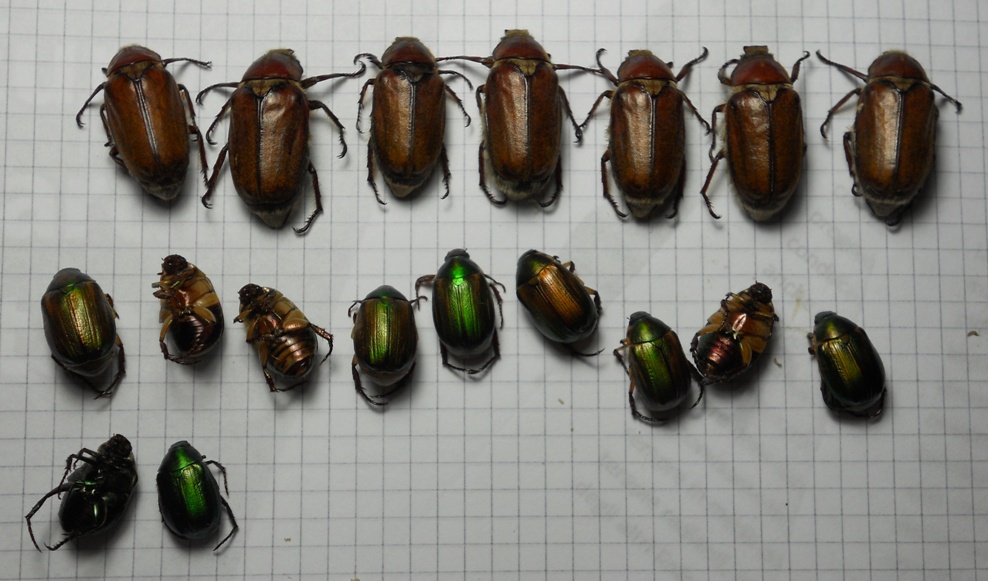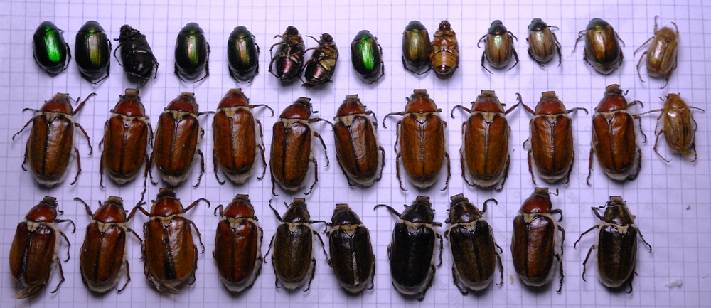 Ciao a tutti! In questo periodo nella mia zona, dalle 20.00 circa in poi (fino a massimo le 23.00) il cielo è coperto di Anoxia sp., Rhizotrogus sp. e Anomala sp.Premetto che gli esemplari di Anomala sp. li ho disposti in ordine di colorazione, e si può notare quello che ho chiesto in questo post..se qualcuno può aiutarmi  (mi scuso per la pessima qualità delle foto  ) Vi faccio vedere il risultato di questi due giorni: Catture del 17/06, Anoxia sp. gironzolavano intorno alle luci, Anomala sp. su una siepe.. Guardando gli esemplari mi è saltato all'occhio subito questo particolare: questa Anoxia presenta una cresta sulla parte esterna della tibia, cosa che in nessun altro esemplare che ho preso è presente.. Catture del 18/06.. Anomala sp. e presumo Mimela junii li ho presi in pieno giorno su di un albero lungo un fiume che passa qui vicino, bastava muovere i rami e ne cadevano, la maggior parte ancora in copula..le Anoxia le ho prese nella sera, in nemmeno dieci minuti..sapete dirmi se si tratta tutte di Anoxia villosa e come si distinguono maschi e femmine??