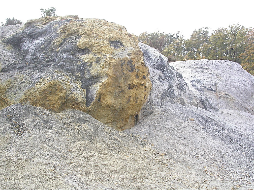 In quella specie di conca pietrosa che ne rimane c'è ovunque odore di zolfo, e ogni pietra ha assunto un colore bianco o giallo, a causa dei composti dello solfo che si formano per reazione con i vapori di acido solfidrico.