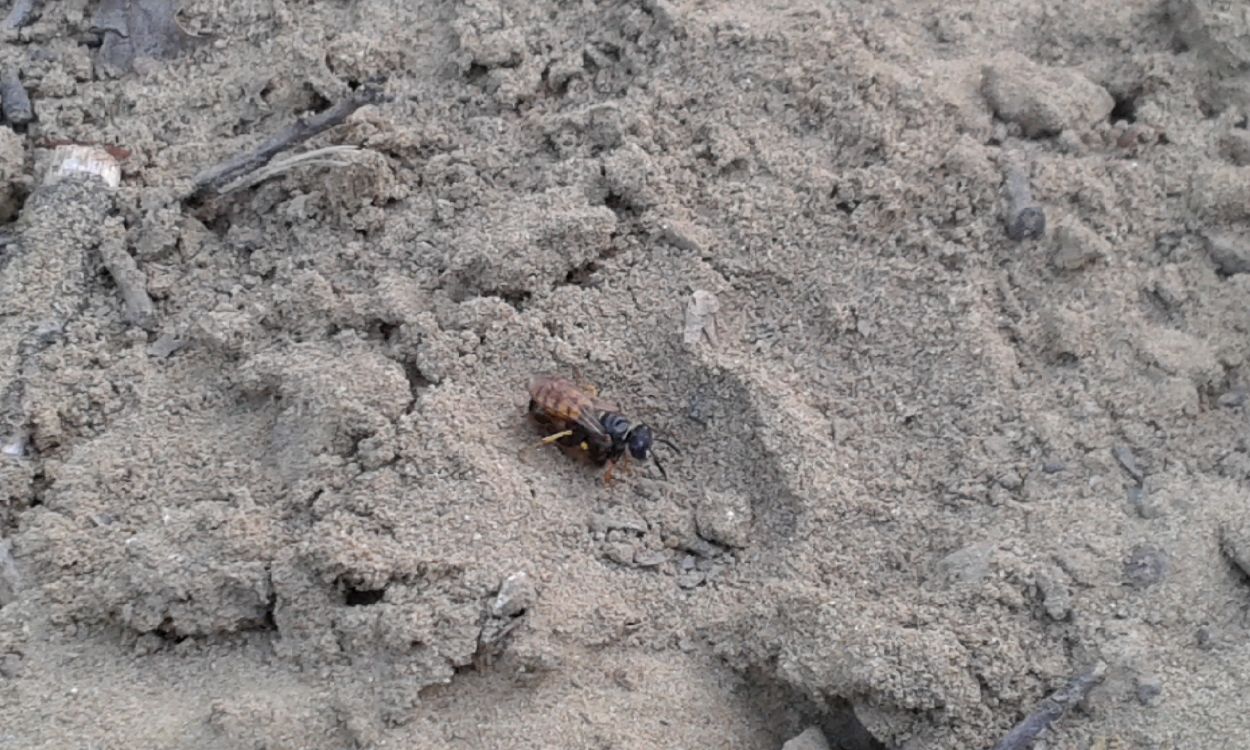 Alcuni grossi esemplari svolazzavano allegramente portandosi dietro delle api ormai paralizzate (purtroppo questa foto non è riuscita) ed interrandole . Oltre a questi sfecidi, altri esemplari più piccoli e molto meno frequenti (presumo appartengano ad un’altra specie) gironzolavano in zona ed esploravano le stesse gallerie.