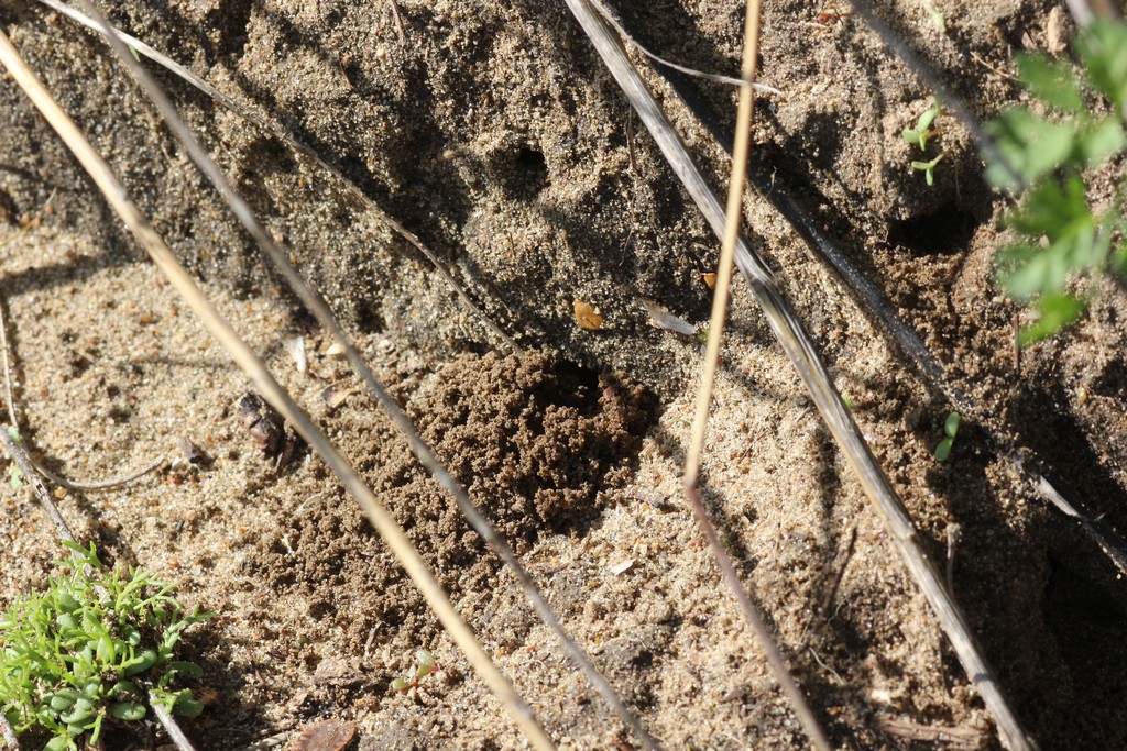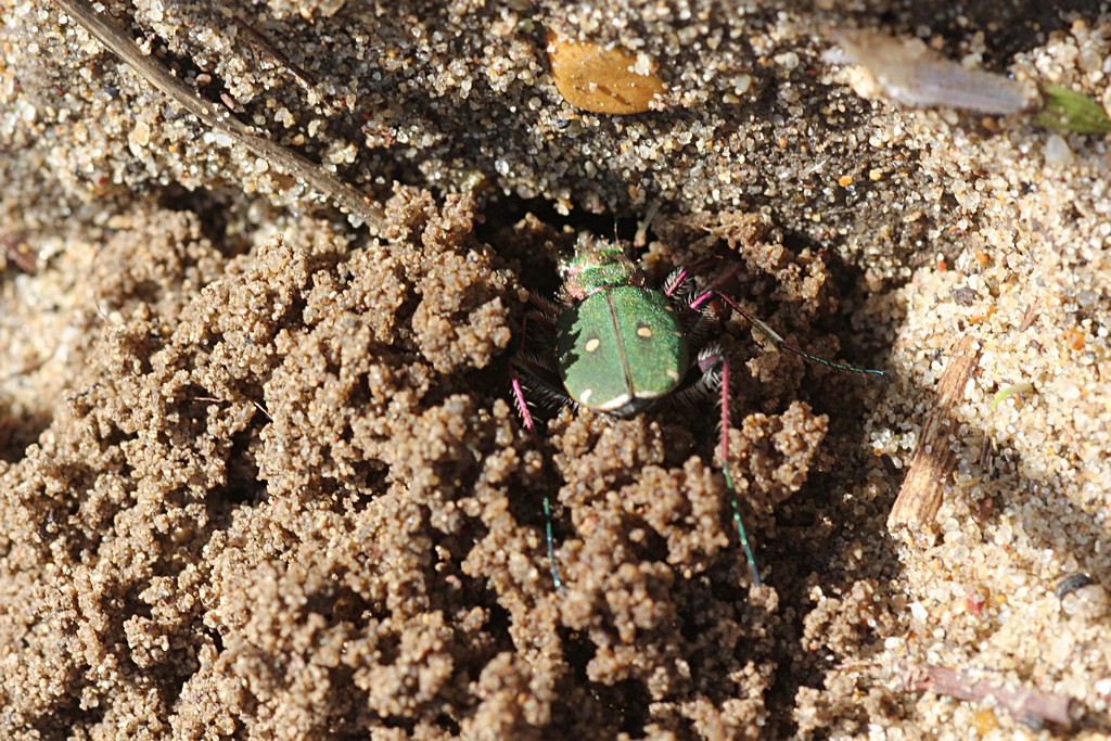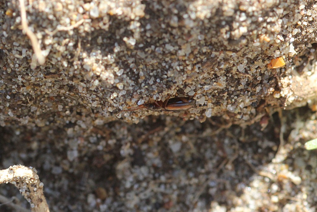 Una Cicindela che si sta scavando una tana alla base di una paretina di sabbia sul bordo del campo