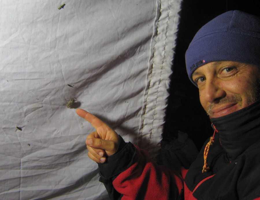E finalmente all’improvviso compare lei! Melolontha sardiniensis Drumont et al., 1999 Ottimo segnale! Alcune foto di rito Per farla “breve” sino a circa mezzanotte e mezza ne arriveranno 3 al lume, poi fino all’una e mezza non ha volato più nulla, c’era davvero freddo e i teli erano fradici. Ci riteniamo soddisfatti e andiamo a “dormire”, io in tenda e Davide in auto come da tradizione. Notare la capotta della macchina alle 6.30. Ci potevano nuotare i Dytiscus! La mattina, qualche Elaphocera erichsoni Jaquelin du Val, 1860 in attività, qui sotto un maschio che scava in cerca della femmina. Troveremo altre due Melolontha nelle due trappoline lungo la strada, una per ciascuna ma nessuna in quella più a valle. Facendo i conti, notte insonne, 5 ore di auto, 5 Melolontha, 2 a Davide e 3 a me (di cui una un po’ malconcia). Siamo contenti, almeno anche quest’anno ho avuto l’emozione di vederla viva. Davide perché non rendi note le tue interessanti scoperte sulla fenologia della Melolontha a seguito dei tuoi "allevamenti", magari nell’altra discussione della melolontha?