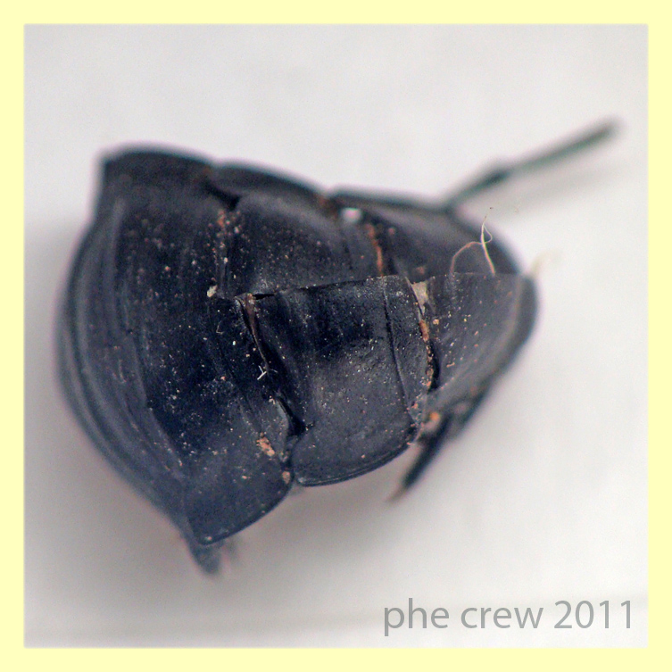 Individuare la punteggiatura elitrale, in questo caso, mi sembra problematico, visto che le elitre non si sono distese e sono rimaste molto rugose. Però probabilmente non è neanche necessario. Già la larva me lo faceva pensare, ma osservando la testa, sia nella pupa che nell'imago, e anche l'apparente mancanza di coste elitrali, direi che si tratta di Ablattaria laevigata, non di Silpha sp. Che si adatterebbe bene anche al cibo di cui si è nutrita la larva: le cozze vive possono essere un valido sostituto delle chiocciole vive di cui prevalentemente si nutrono in natura.