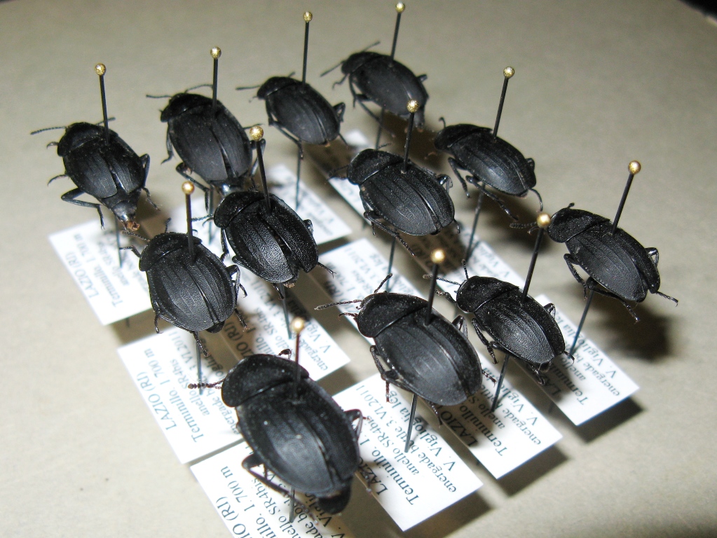 Passeggiando sul terminillo ho trovato una bottiglietta di Gatorade senza tappo piena di bestiole. Il liquido era quasi tutto bevuto o evaporato al sole ed il contenuto era di più di 20 silphidi di almeno tre specie diverse più qualche carabo e tenebrionide, tutti morti o moribondi. La puzza era tremenda ma mi sono avvantaggiato di una trappola involontaria e inaspettata.  Ho tenuto gli esemplari migliori. In questo primo post metto una foto dell'armata di quella che credo una Silpha e magari la obscura, confrontandola con quella del Trentino recentemente postata. Sono 12, molto simili ed hanno le carene senza angoli bruschi a parte alcune che ne hanno un piccolo accenno. In particolare la A3, B1, C1, C2 (se per A B e C intendiamo le righe e i numeri crescenti da sinistra a destra). Ma in realtà un accenno inpercettibile mi pare di vederlo in tutti i Silphidae che ho sott'occhio. Dalle foto qualche ombra si vede pure in altri esemplari. Le dimensioni vanno da 14 a 17 mm senza contare gli addomi sporgenti. Se potete confermarmi la specie ve ne sarei grato, se pensate che ci siano più specie mischiate e volete foto dettagliate di qualche esemplare in particolare ditemelo e provvederò. Prossimamante metterò le altre due specie della bottiglia.