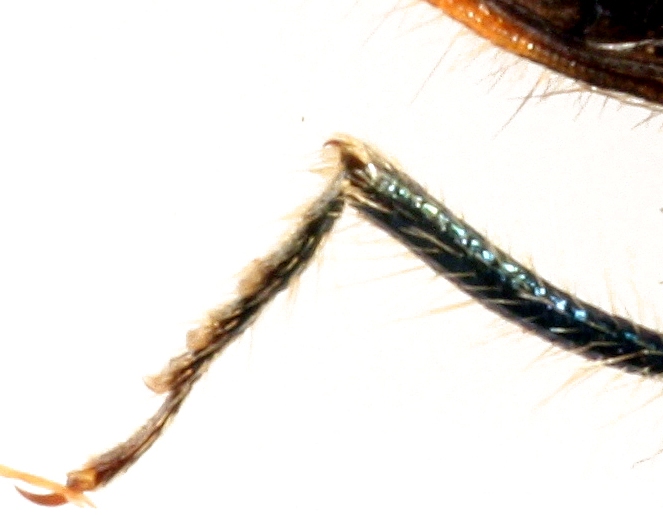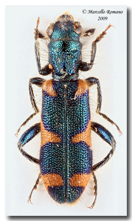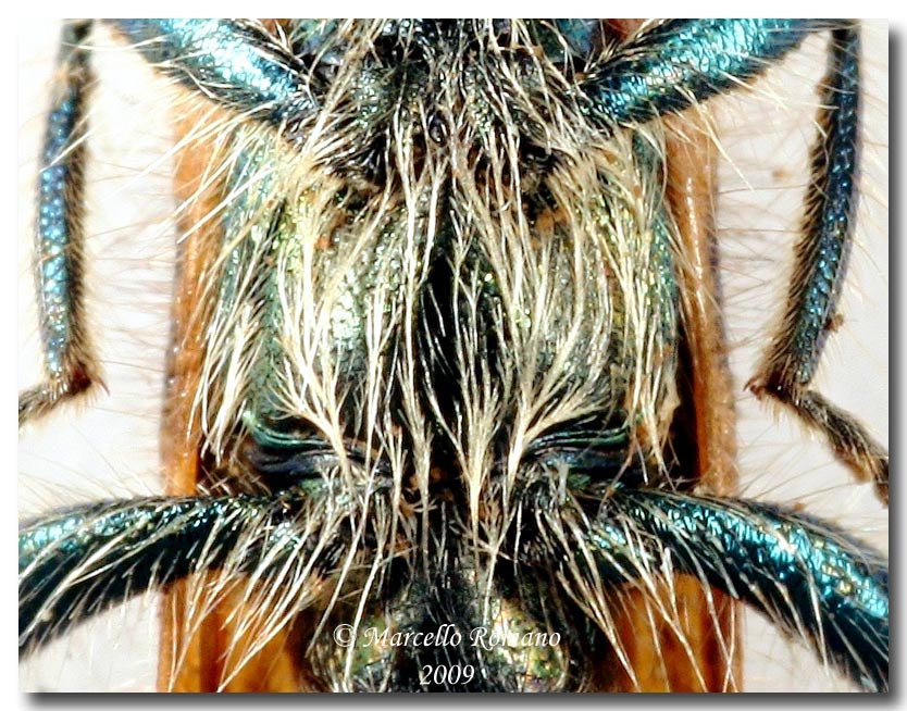 Le dimensioni sono assai minori (9 mm.), noto differenze nell'estensione e nel disegno delle macchie giallo-arancio elitrali e anche la colorazione metallica di fondo vira più al verde che al blu. Poi la pubescenza mi sembra meno folta, specialmente ai lati del pronoto, dove noto la presenza di aree lisce, non punteggiate, presoo la base, assenti in quello etc...