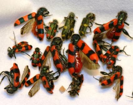 Sinceramente dovrebbero essere solo 2 specie. I 2 exx. all'interno del rettangolo celeste sono Trichodes sipylus (Linnaeus, 1785) L'esemplare all'interno dell'ellisse gialla, potrebbe essere ancora Trichodes sipylus (Linnaeus, 1785) (50%) oppure Trichodes quadriguttatus Adams, 1817 (50%). Andrebbe girato su un fianco per stabilire con certezza la specie. Tutti gli altri sono Trichodes affinis Chevrolat, 1843. Anche l'esemplare all'interno dell'ellisse verde, potrebbe essere Trichodes affinis Chevrolat, 1843 ma bisognerebbe poterlo vedere meglio. Ho qualche dubbio.... Queste determinazioni sono fortemente condizionate dall'area di provenienza. Purtroppo per essere certo al 100% dovrei esaminarli un po' più da vicino. Gran bella tecnica quella dei piattini!!! Quelle poche volte che l'ho usata ho fatto strage di ditteri, imenotteri, ecc. Cleridae proprio pochini....... Visti i risultati di Guido, sicuramente ci riproverò!
