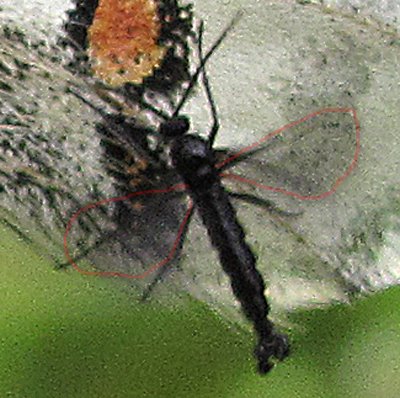Purtroppo però, da totale ignorante in Ditteri, mi sa che la bestia della foto non era brachittera. Ho provato a delineare il contorno delle due aree più scure che si vedono ai lati del corpo, è sembrano proprio essere le ali in movimento (soprattutto la destra, poichè la sinistra si sovrappone ad un'area più scura dell'ala della farfalla). Considerate che la foto è stata scattata a 1/60 di secondo, e con tempi di scatto così lunghi è normale che le ali vengano mosse e quasi invisibili, se non come una specie di zona nebulosa.