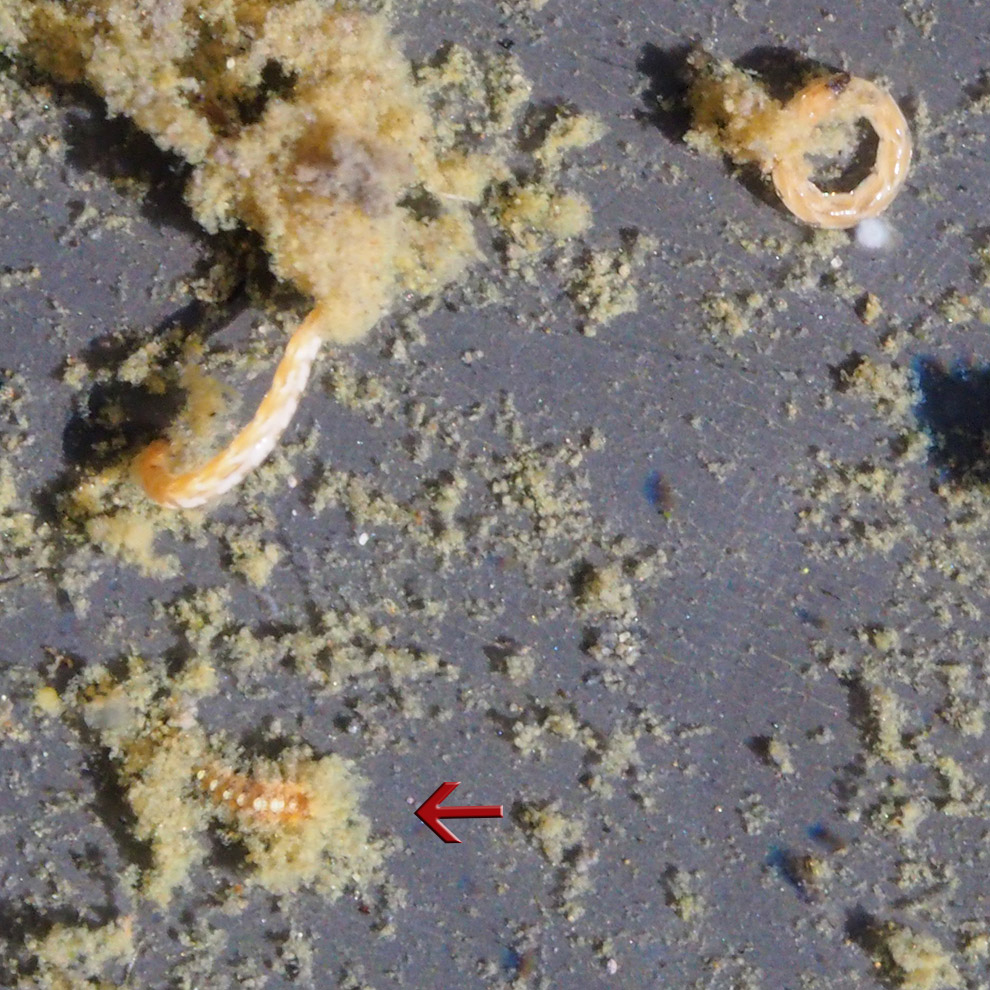Quello più grosso e chiaro si dimenava fortemente. Sembrava volesse liberarsi dal 'guscio-astuccio' sottile e lungo al quale sembra essere legato (la "mucillagine" ha impedito di fatto di capire).