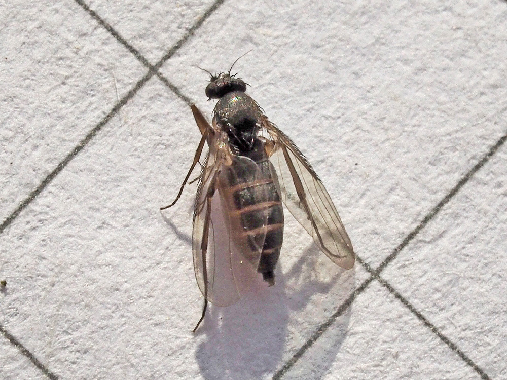 Si, è certamente un Phoridae, ma non è facile andare oltre. Io non sono ancora riuscito a trovare il genere di quelli che frequentano i vetri delle mie finestre, non riesco a seguire le chiavi. In termini puramente statistici potrebbe anche essere una Megaselia: pare che oltre il 60% delle specie descritte di Phoridae appartengano a questo genere.