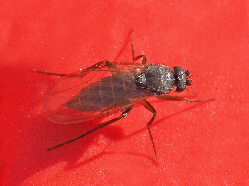 Si, è certamente un Phoridae, ma non è facile andare oltre. Io non sono ancora riuscito a trovare il genere di quelli che frequentano i vetri delle mie finestre, non riesco a seguire le chiavi. In termini puramente statistici potrebbe anche essere una Megaselia: pare che oltre il 60% delle specie descritte di Phoridae appartengano a questo genere.